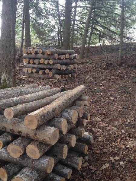 Gwen’s shittake mushroom logs are inoculated and waiting in their Hemlock grove for next spring’s harvest.