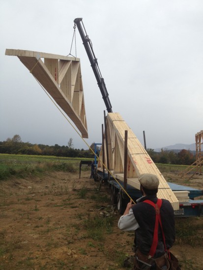Our barn has been a feat of team work, and we are so excited that it is almost finished. Chad and his horses pulled nearly all the lumber for it out of various Essex woods. His training as a Biological woodsmen means that he leaves these woods healthier and more productive than they were (read more about BWs at www.draftwood.com). The construction has been community supported from day-one: neighbors John Bigelow and Pete Sayward (members of Peter Gucker’s team) ran the excavators that built the road and dug the foundation, neighbor Hugh Goff milled the lumber, neighbor Doug Kerr ran the crane that lifted the trusses into place, local businesses Ward Lumber and Maicus Building Supplies helped us find the best prices for the remaining lumber and roofing.