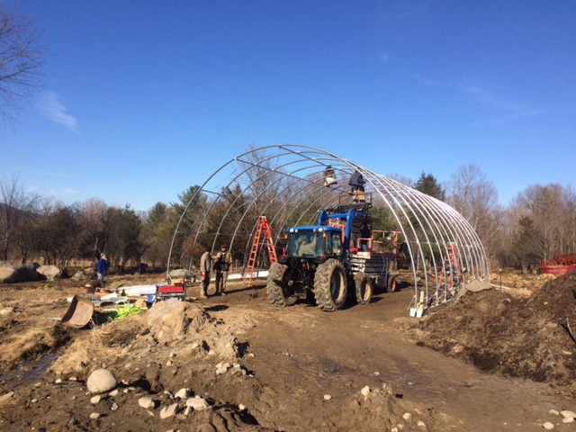 “Here are a few photographs of the Reber Rock Farm’s temporary barn going up. The hoop supports, the skin on the ground and being pulled over them. The tension guy wires being fabricated, people eating a great lunch provided by Reber Rock Farm, the last remaining volunteers jumping for joy upon completion. There were about 25 people throughout the day, many for most of the day.” ~ Tom Duca