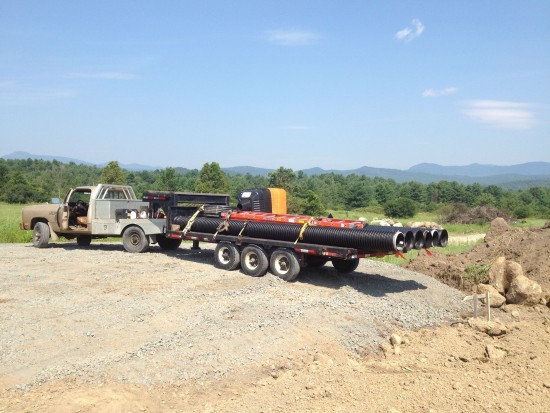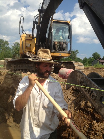 With the first batch of hay in we switched back to setting the foundation of the barn. With rented excavators (Chad drives excavators almost as well as he drives horses!) and lots of muscle power the farm crew powered through the four hottest days of the summer in the ditch to lay water and electric lines, and set, level, plumb, and back fill the foundation of our 100′ x 40′ pole barn.
