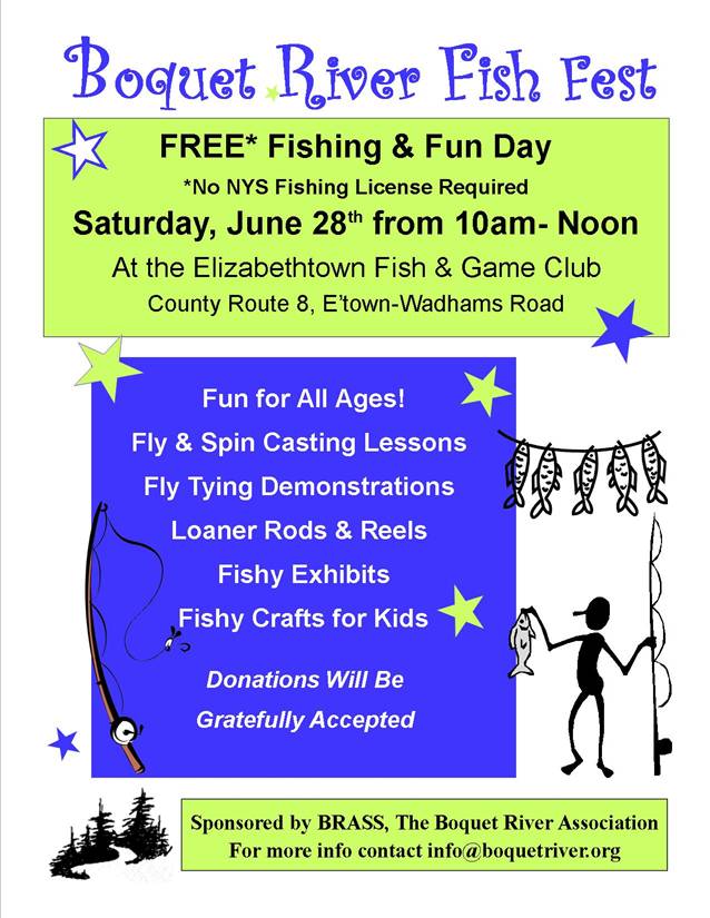 - Boquet River Fish Fest will take place at the Elizabethtown Fish & Game Club. 10:00 am-12:00 pm. Check Essex, NY Calendar for details.